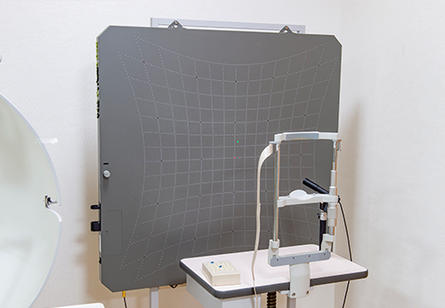 眼の見える範囲(視野)を測定する器械です。 特定の位置に出る明るさの違う光が見えたらブザーを押す検査です。