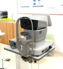 この器械は眼底撮影する器械で、特に眼底の網膜後極部(中央部)を高解像度で撮影します。これにより従来の眼底カメラとは比較にならないほど網膜の詳細な状態が明らかになりました。加齢黄斑変性、静脈閉塞症、黄斑上膜などの眼底疾患や糖尿病眼合併症(糖尿病網膜症)の経過観察などに威力を発揮します